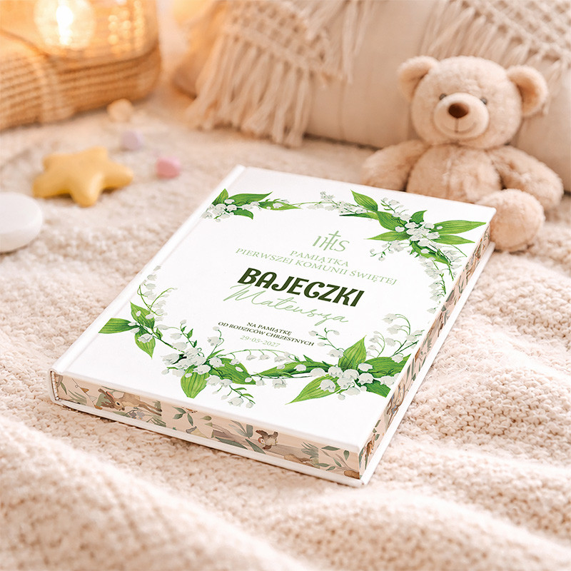 Personalizowana książka z bajkami stworzona z myślą o Pierwszej Komunii Świętej. Dzięki personalizacji poprzez umieszczenie imienia dziecka, dedykacji od chrzestnych oraz daty wydarzenia, publikacja staje się wyjątkowym i trwałym wspomnieniem tego ważnego dnia. Twarda oprawa oraz delikatna grafika z motywem konwalii nadają książce elegancki, klasyczny charakter, idealnie wpisujący się w estetykę pamiątek komunijnych.