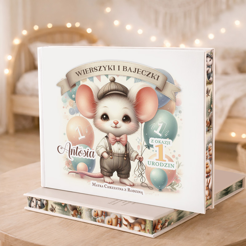 Na okładce książeczki znajduje się ilustracja myszki otoczona pastelowymi balonami, a także imię dziecka i podpis od osoby wręczającej. Dzięki temu prezent nabiera unikalnego i osobistego charakteru. Wewnątrz znajdziesz bajki z morałem oraz rymowanki wierszyki idealne do wspólnego czytania z rodzicami. Teksty wspierają rozwój wyobraźni, a jednocześnie wprowadzają malucha w świat wartości i emocji. Dodatkowo w książce znalazły się ciekawe zadania do wykonania przez dziecko.