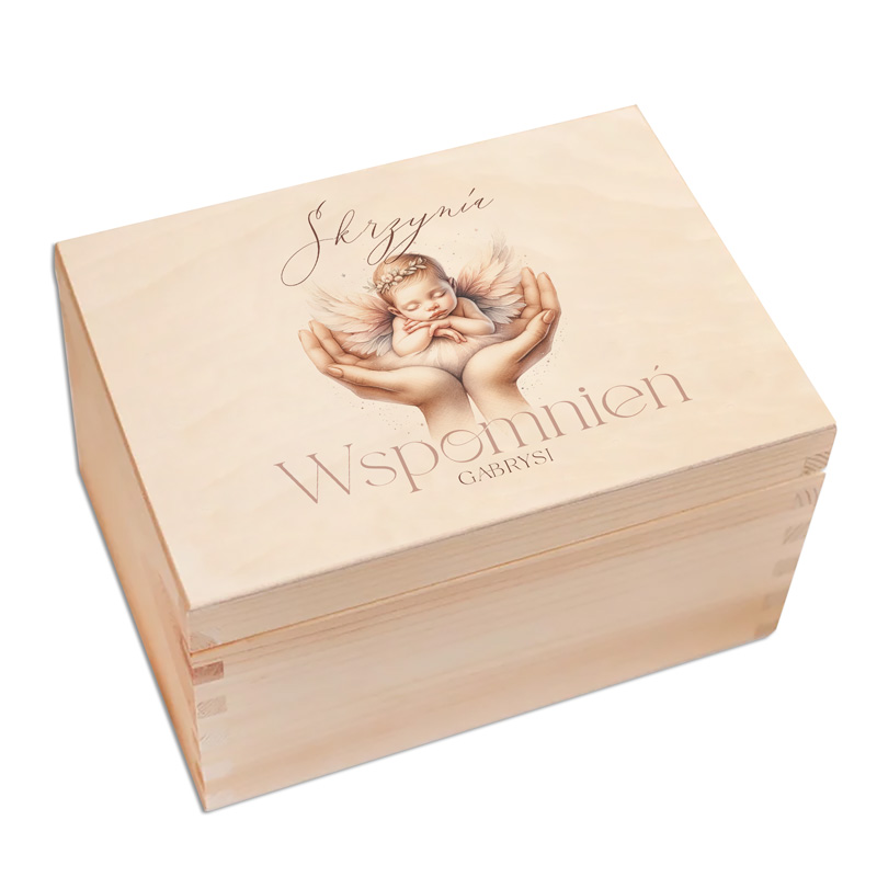 Skrzynka zachwyca delikatną grafiką śpiącego aniołka oraz personalizacją w postaci imienia, co nadaje jej indywidualnego, sentymentalnego charakteru. To nie tylko piękna ozdoba, ale również praktyczne miejsce do przechowywania drobiazgów o wielkiej wartości – pierwszego smoczka, szpitalnej opaski, zdjęć, ubranek czy kartek z życzeniami. Wykonana z solidnego drewna, co gwarantuje większą trwałość, ale i estetykę.