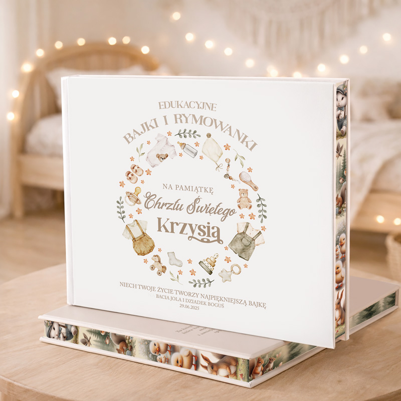 Edukacyjne Bajki z Wierszykami Na Dobranoc Prezent Na Chrzest Święty to wyjątkowa książka z personalizacją. Zawiera 10 bajek z morałem i 10 rymowanek. Idealna do wieczornego czytania. Estetyczna, trwała i pełna ciepła – doskonała pamiątka na Chrzest i pierwsze lata życia dziecka.