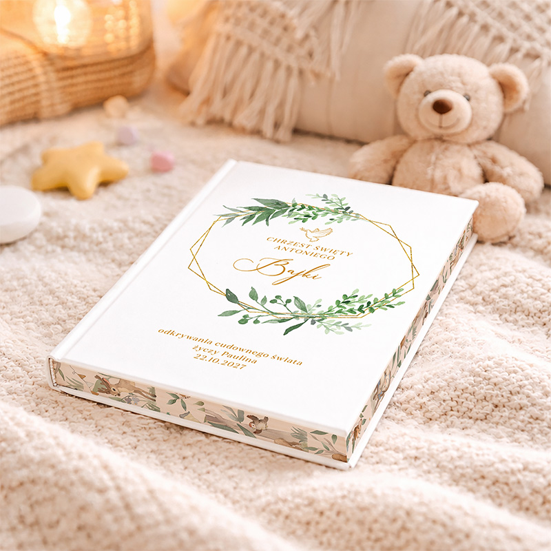 Elegancka okładka wyróżnia się delikatnym wieńcem z zielonych gałązek w złotej ramce oraz subtelnym motywem gołębicy – symbolem duchowości i pokoju. Złoty napis „Chrzest Święty” oraz stylizowana czcionka dodają uroczystości i klasy. Całość utrzymana jest w stylu minimalistycznym, a jednocześnie głęboko symbolicznym, co idealnie pasuje do charakteru tej ważnej uroczystości.