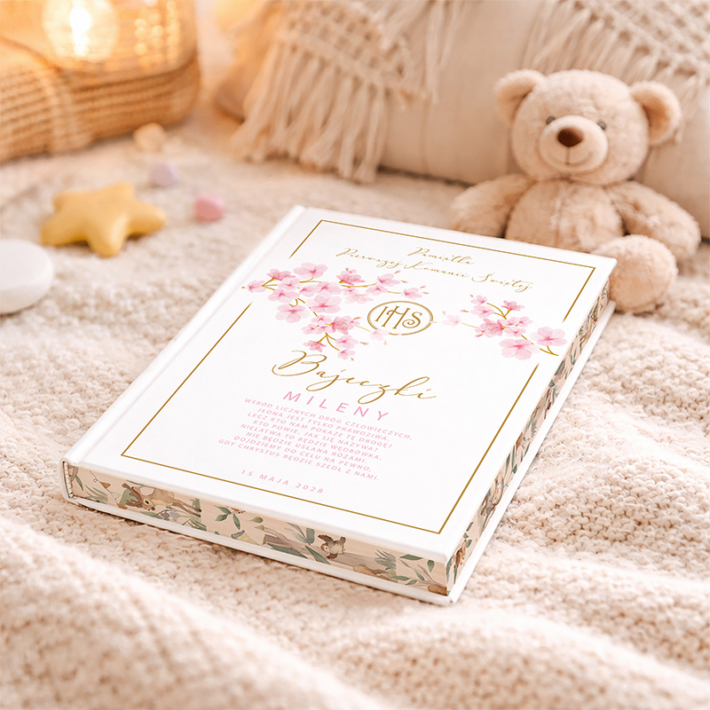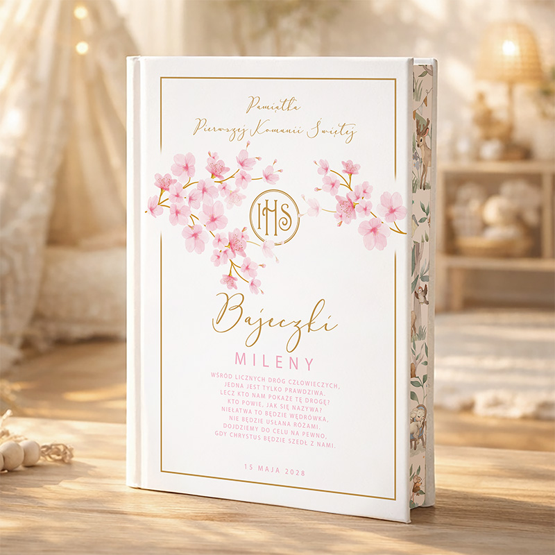 Personalizowana książka z bajkami to wyjątkowa Pamiątka Pierwszej Komunii Świętej dla dziewczynki. Na okładce umieszczone jest imię dziecka i data uroczystości, a elegancka szata graficzna z motywem kwiatów wiśni i symbolem IHS nadaje całości duchowego wymiaru.