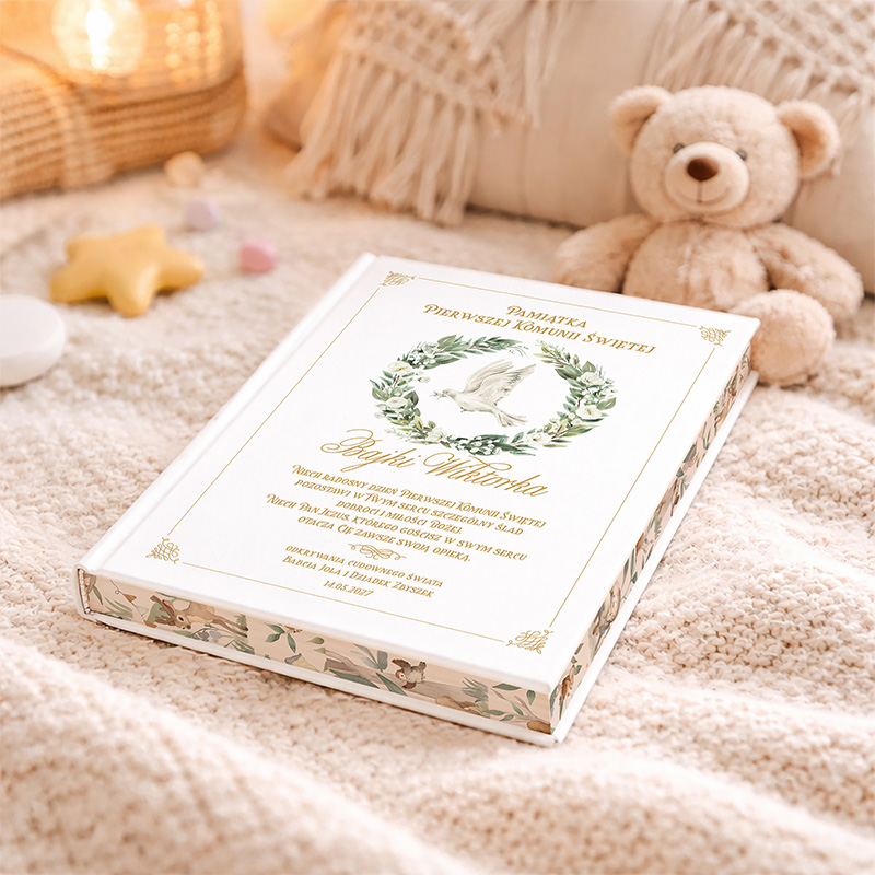 Personalizowana książka z bajkami to elegancki prezent na pierwszą komunię. Wyróżnia się klasyczną okładką utrzymaną w biało-złotej kolorystyce, wzbogaconą o subtelny wieniec z białych kwiatów i oliwnych liści. W centrum grafiki znajduje się symboliczna postać gołębicy – znaku Ducha Świętego oraz pokoju – co idealnie podkreśla religijny charakter uroczystości Pierwszej Komunii Świętej. Całość tworzy spójną, szlachetną kompozycję.