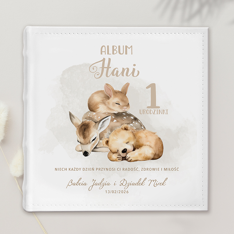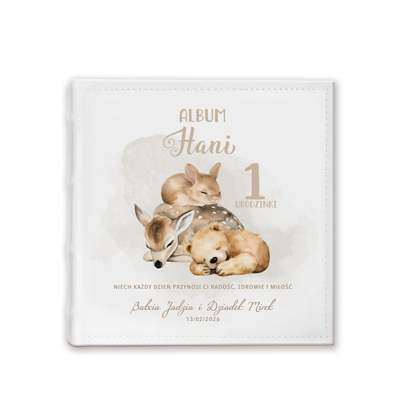 Personalizowany album na zdjęcia to wyjątkowy i praktyczny prezent na roczek, który w piękny sposób pozwoli zachować najcenniejsze wspomnienia z pierwszych lat życia dziecka. Urocza okładka z ilustracją leśnych zwierzątek, imieniem malucha, datą i dedykacją od bliskich nadaje mu niepowtarzalny, pełen uroku charakter.