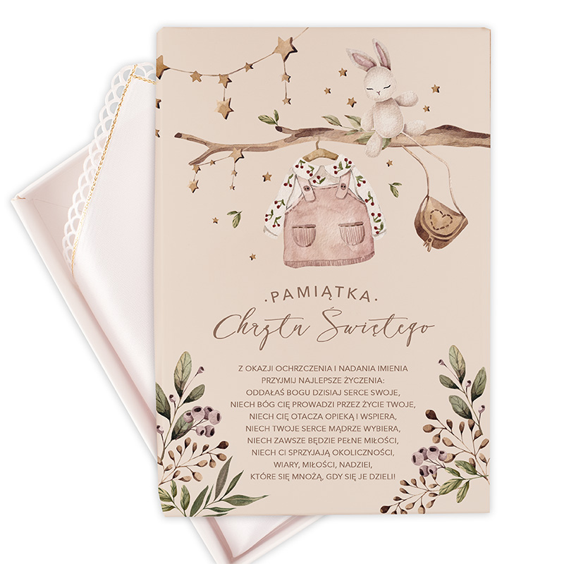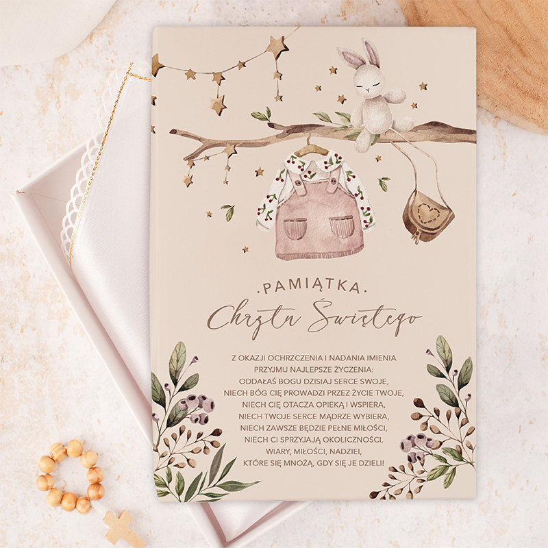 Pudełko na szatkę do Chrztu Świętego dla dziewczynki to praktyczny dodatek, dzięki któremu szatka pozostanie czysta i dobrze zabezpieczona. Świetnie sprawdzi się w kościele podczas ceremonii, a później będzie służyć jako miejsce do przechowywania szatki w domu. Wykonane jest z jasnej tektury i ozdobione etykietą w pastelowych odcieniach. Na grafice widoczna jest gałązka z zawieszoną różową sukieneczką, torebką w kształcie serca oraz siedzącym pluszowym króliczkiem. Całość uzupełniają girlandy z gwiazdkami oraz dekoracyjne liście i drobne owoce, które nadają oprawie delikatności.