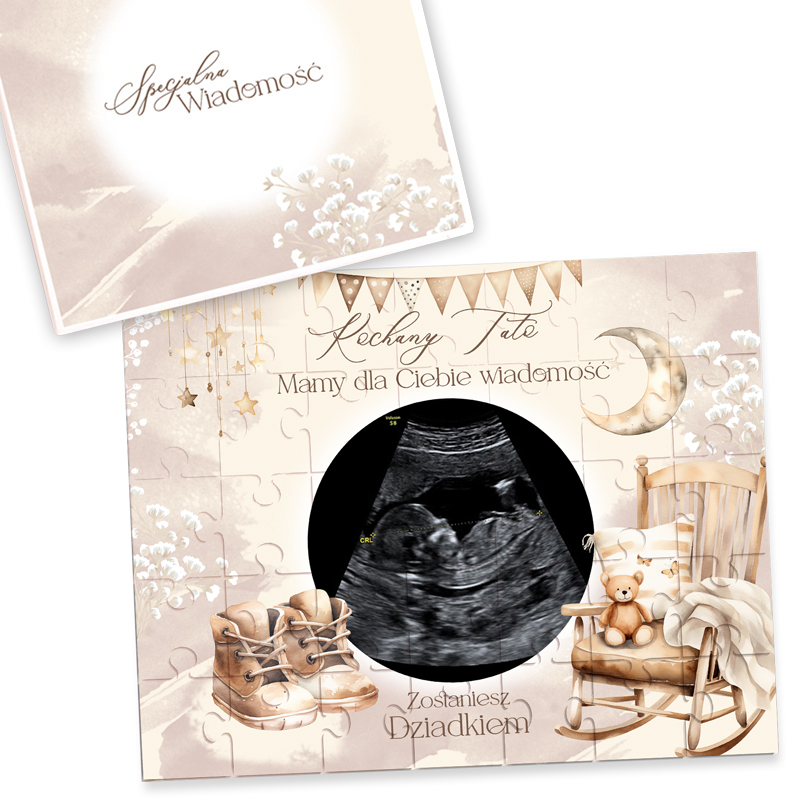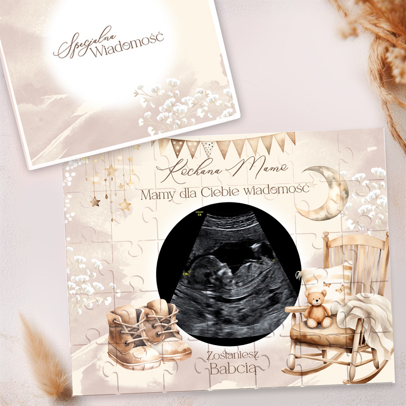 Zdjęcie USG umieszczone w centralnym miejscu staje się osobistym i symbolicznym akcentem, a otaczające je grafiki w stylu boho – dziecięce buciki, miś na fotelu, girlandy i księżyc – tworzą wyjątkową atmosferę. Całość zapakowana jest w elegancką kopertę z napisem „Specjalna Wiadomość”, dzięki czemu nie wymaga dodatkowego opakowania. To gotowy do wręczenia prezent, który wywoła uśmiech i łzy szczęścia. Puzzle ze zdjęciem USG – kreatywne powiadomienie rodziców o ciąży doskonale sprawdzą się zarówno jako prezent na Dzień Babci i Dziadka, jak i w zupełnie niespodziewanym momencie – np. przy rodzinnym obiedzie lub spotkaniu. Dzięki możliwości wyboru wersji dla mamy, taty lub obojga rodziców, możesz dopasować wiadomość do konkretnej osoby.