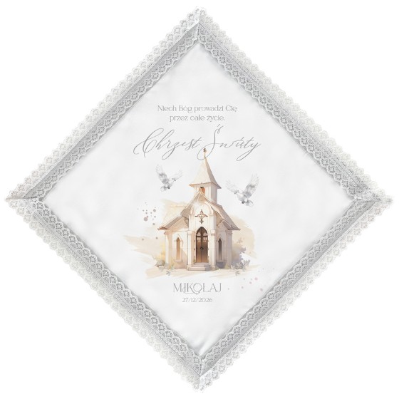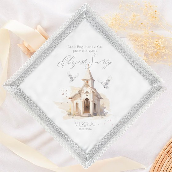 To wyjątkowo elegancki i pełen symboliki dodatek, towarzyszący dziecku w jednym z najważniejszych dni jego życia. Delikatne zdobienia, subtelna grafika kościółka oraz personalizacja obejmująca imię malucha i datę uroczystości nadają jej niepowtarzalny, osobisty charakter.