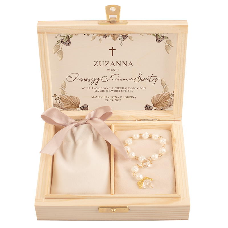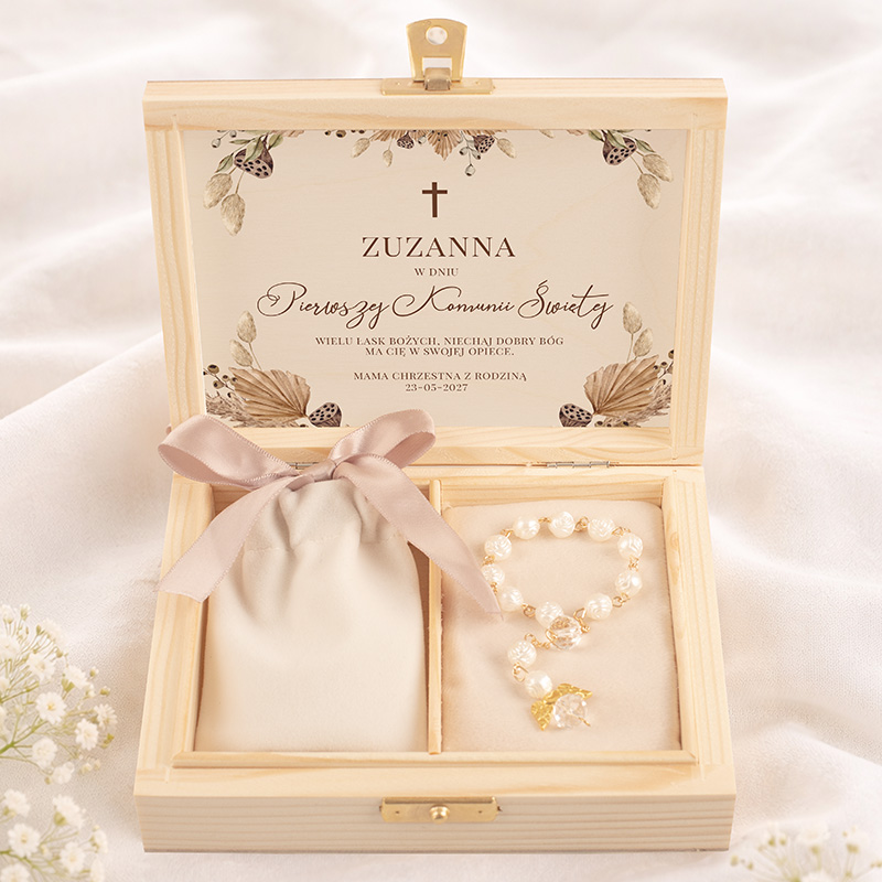 Wykonana z naturalnego drewna, zachwyca subtelnym wzornictwem i precyzyjnym wykonaniem. To pamiątka, która pozostanie z dzieckiem na długie lata, przypominając o tym ważnym dniu. Wnętrze skrzyneczki zostało starannie zaprojektowane. W górnej części umieszczono personalizowaną dedykację, która może zawierać imię dziecka, datę uroczystości. Delikatna grafika w stylu boho nadaje całości wyjątkowego charakteru i elegancji.