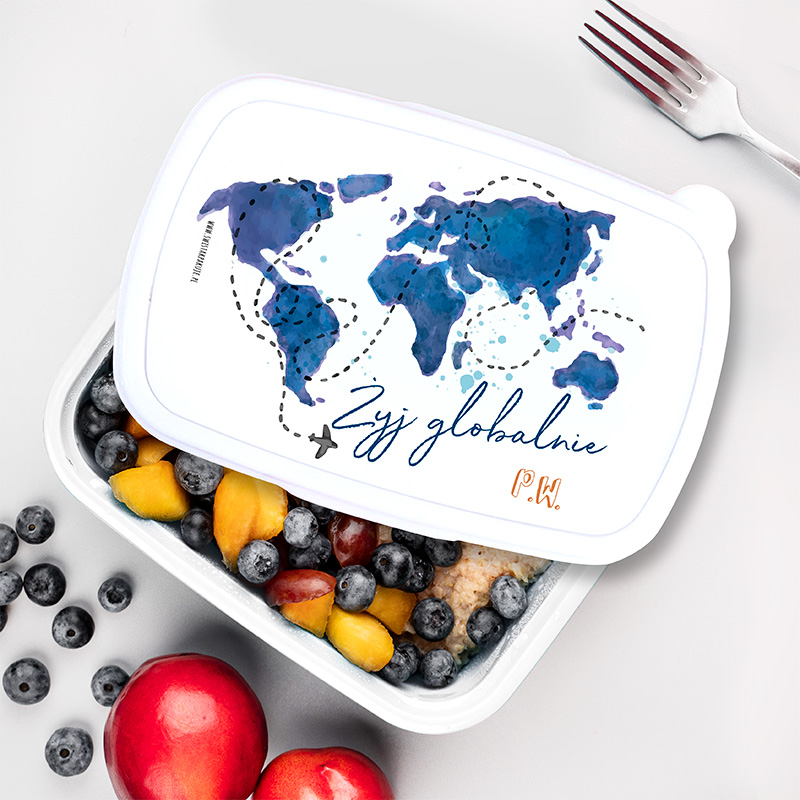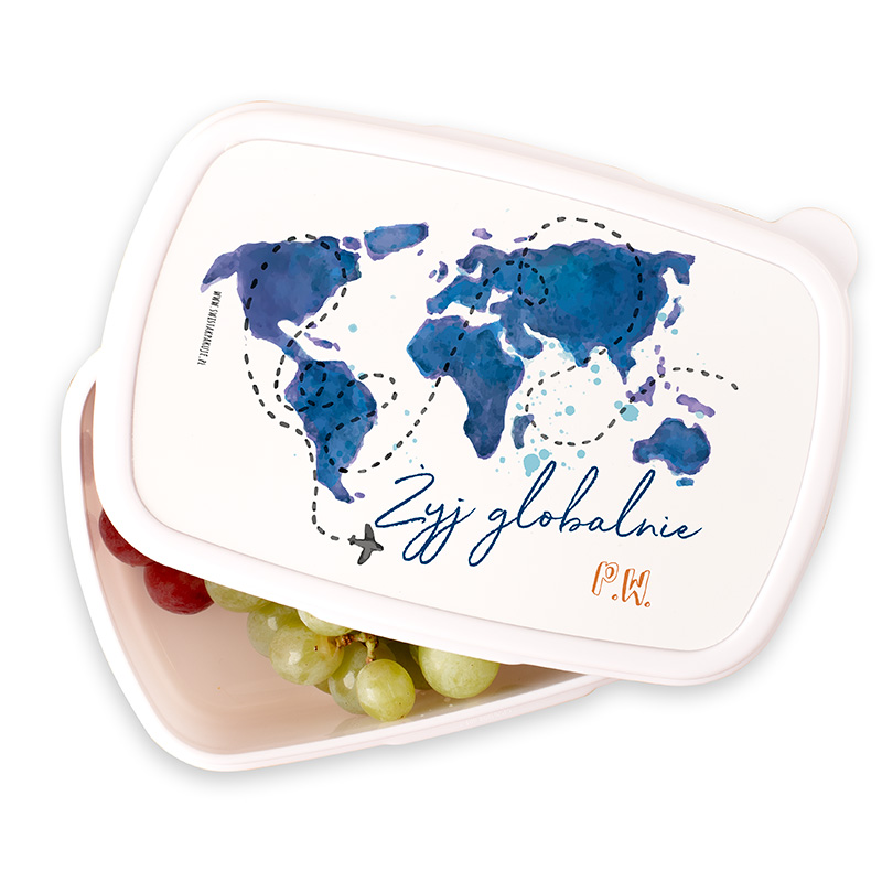 Śniadaniówka z mapą świata i inicjałami to pojemnik, który inspiruje i ułatwia codzienną organizację posiłków. Grafika w odcieniach granatu i błękitu przedstawiająca glob z trasami lotniczymi i samolotem wprowadza motyw podróży, a napis „Żyj globalnie” dodaje całości nowoczesnego charakteru. Dzięki inicjałom dziecka lunchbox nie sposób pomylić z innym.