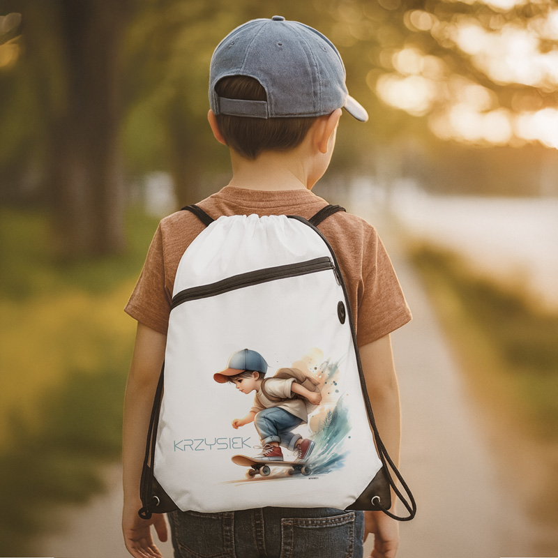 Worek z Personalizacją Dla Małego Skejta to idealne akcesorium dla chłopców, którzy kochają jazdę na deskorolce i aktywność na świeżym powietrzu.