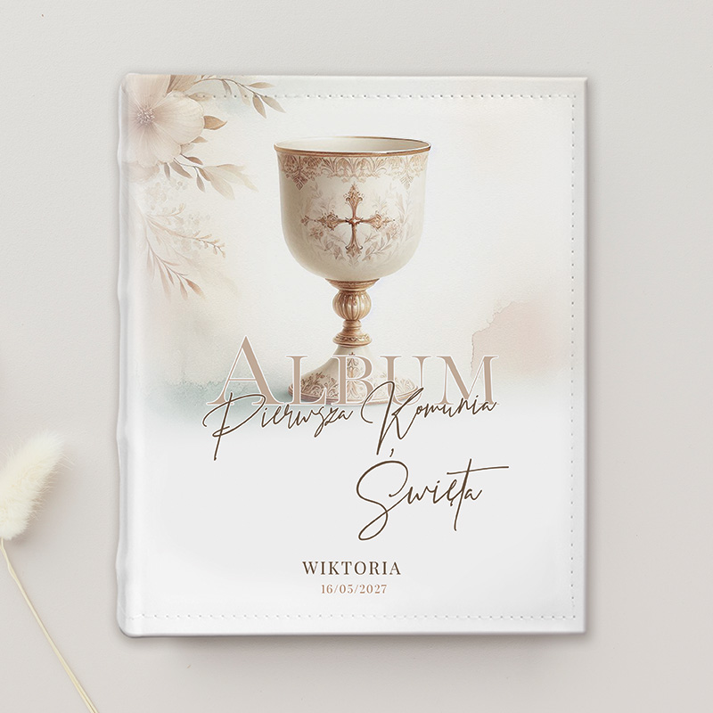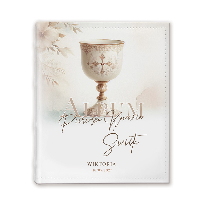 Album wyróżnia się subtelną, boho stylistyką w jasnych, beżowo-brązowych odcieniach. Na okładce znajduje się dekoracyjny kielich oraz delikatne kwiatowe akcenty, które tworzą elegancką i spokojną kompozycję. Całość uzupełnia napis „Album Pierwsza Komunia Święta” oraz imię i data – i to właśnie te elementy podlegają personalizacji. Starannie wykonana okładka nadaje albumowi wyjątkowego, pamiątkowego charakteru.