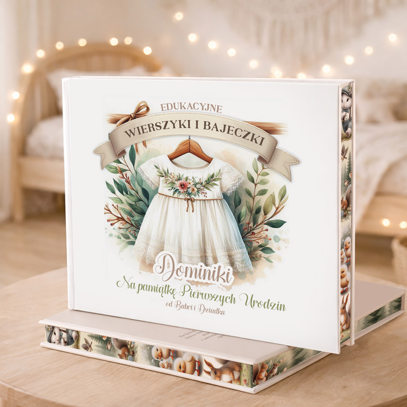 Okładka książki to małe dzieło sztuki, które od razu przykuwa uwagę. W centralnym miejscu znajduje się urocza, elegancka sukienka w stylu vintage, ozdobiona pięknym kwiatowym wzorem. Sukienka jest otoczona subtelnymi liśćmi i pastelowymi kwiatami, co nadaje całości delikatnego i magicznego charakteru. Na górze widnieje wstążka z napisem "Edukacyjne Wierszyki i Bajeczki", a poniżej można znaleźć miejsce na imię dziecka oraz specjalną dedykację. To sprawia, że książka staje się osobistym, niezapomnianym prezentem.