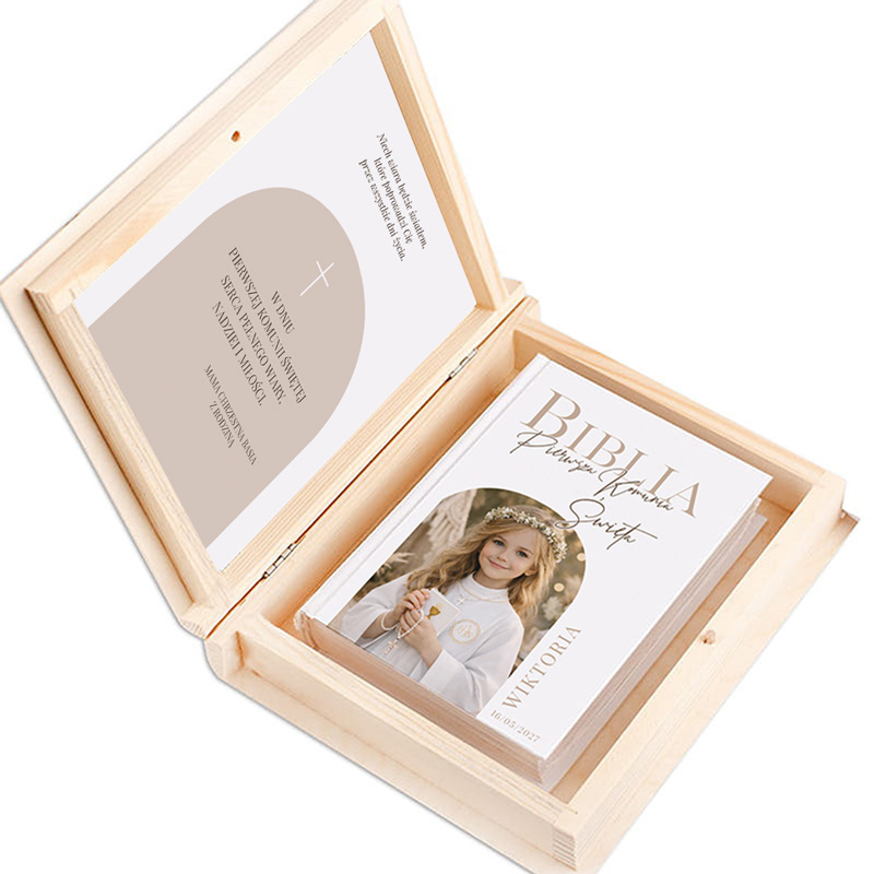 Biblia komunijna ze zdjęciem na okładce w drewnianym pudełku to elegancki, personalizowany prezent na Pierwszą Komunię Świętą.