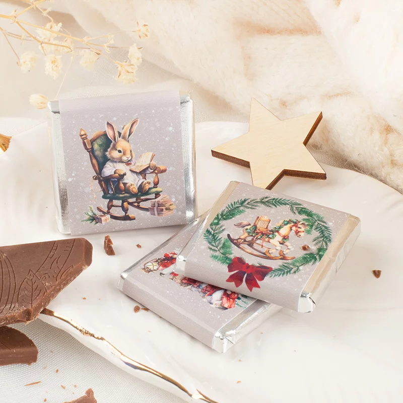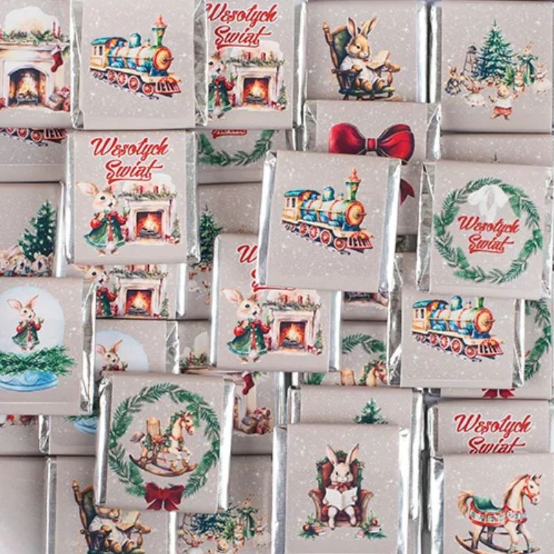 Każda czekoladka świąteczna z ilustracją zapakowana jest w foliowy srebrny papierek oraz dodatkową warstwę papieru z nadrukiem. Grafiki mają losowy charakter – mogą przedstawiać zimowe zwierzątka, choinkę, kominek, lokomotywę lub napisy „Wesołych Świąt” w otoczeniu bożonarodzeniowych dekoracji. Kolory są stonowane i ciepłe, idealnie wpisujące się w estetykę świąteczną.
