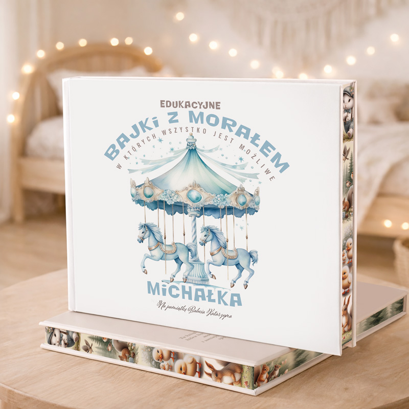 Edukacyjne bajki dla dziecka to zbiór starannie dobranych opowiadań i wierszyków z morałem, które pomagają dzieciom zrozumieć świat w prosty, ale znaczący sposób. Na okładce znajduje się piękna ilustracja eleganckiej karuzeli w odcieniach błękitu i bieli. Konie na karuzeli są subtelnie zdobione, a ich detale przyciągają wzrok. Na samej górze widnieje napis: „EDUKACYJNE BAJKI Z MORAŁEM, w których wszystko jest możliwe”, co nadaje całości wyjątkowego charakteru. Imię dziecka, zostało wyeksponowane pod grafiką części okładki, dzięki czemu książka staje się spersonalizowanym prezentem. Dodatkowo można dodać dedykację, np. „Na pamiątkę Babcia Katarzyna”, co sprawia, że podarunek nabiera jeszcze większego znaczenia. W środku książki znajdziemy zarówno opowiadania, jak i wierszyki z morałem, które poruszają tematy przyjaźni, odwagi czy szacunku dla innych. Każdy tekst jest dostosowany do poziomu małego czytelnika, a barwne ilustracje dodają magii każdej historii. Twarda oprawa sprawia, że książka jest trwała i odporna na codzienne użytkowanie. Dzięki temu stanie się pamiątką, która przetrwa lata. Papier wewnętrzny jest przyjemny w dotyku i idealny dla małych rączek, które dopiero odkrywają świat literatury.