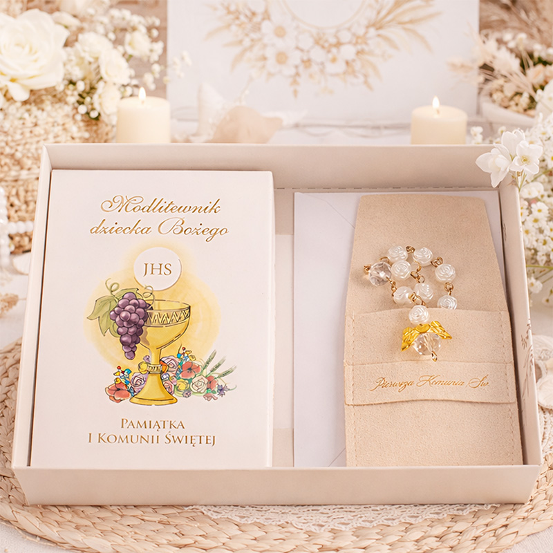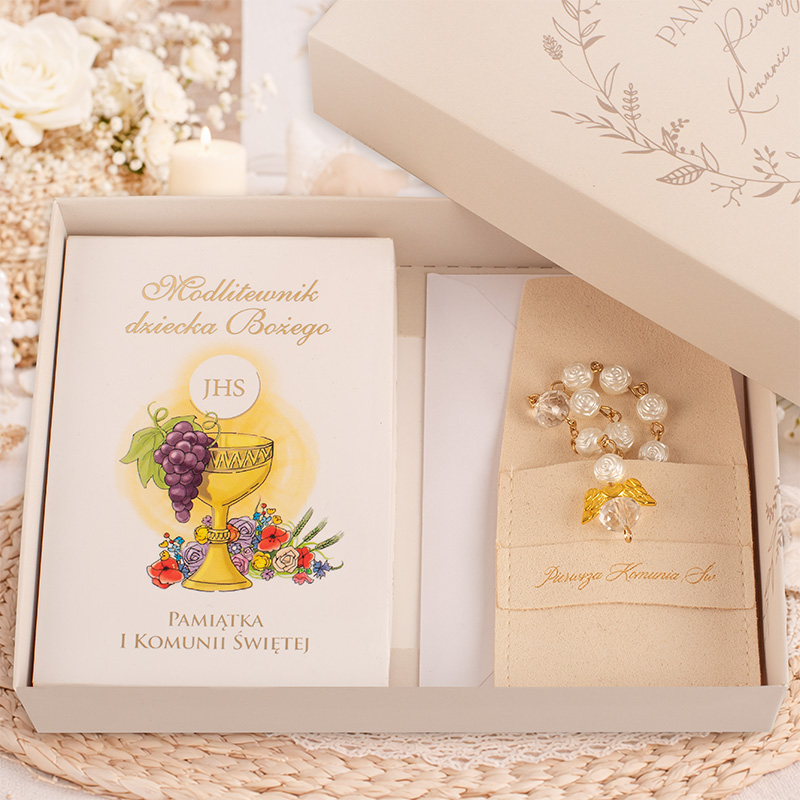 Kompletna i elegancka pamiątka Pierwszej Komunii Świętej. Gotowy zestaw komunijny to idealne rozwiązanie dla osób, które szukają wyjątkowego, a jednocześnie praktycznego prezentu na tę ważną okazję.
