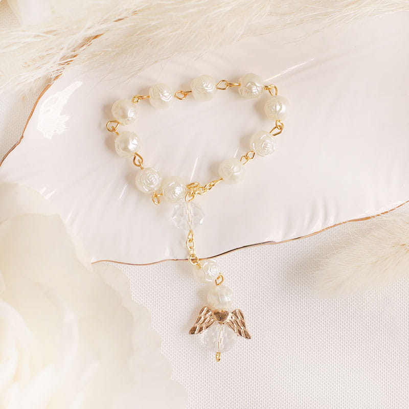 Zestaw został starannie skomponowany. W jego skład wchodzi modlitewnik dziecka Bożego, mały różaniec, zamszowe etui, koperta. Każdy element utrzymany jest w delikatnej, jasnej kolorystyce. Całość zapakowana jest w ozdobne pudełko z dekoracyjnym motywem roślinnym, dzięki czemu zestaw jest gotowy do wręczenia bez potrzeby dodatkowego pakowania.