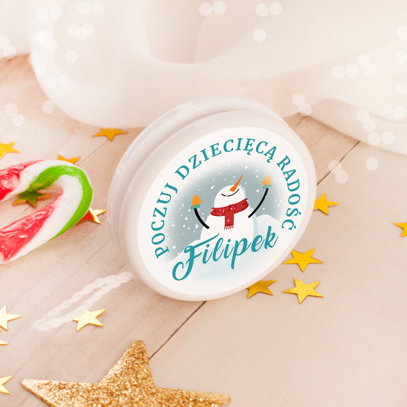 Produkt wykonany jest z tworzywa sztucznego w kolorze białym. W jego centralnej części znajduje się naklejka z radosnym bałwankiem, odzianym w czerwony szalik i rękawiczki, unoszącym radośnie ręce ku górze. Na tle delikatnie prószącego śniegu widnieje napis „Poczuj dziecięcą radość” oraz spersonalizowane imię, które można dowolnie dobrać do odbiorcy.