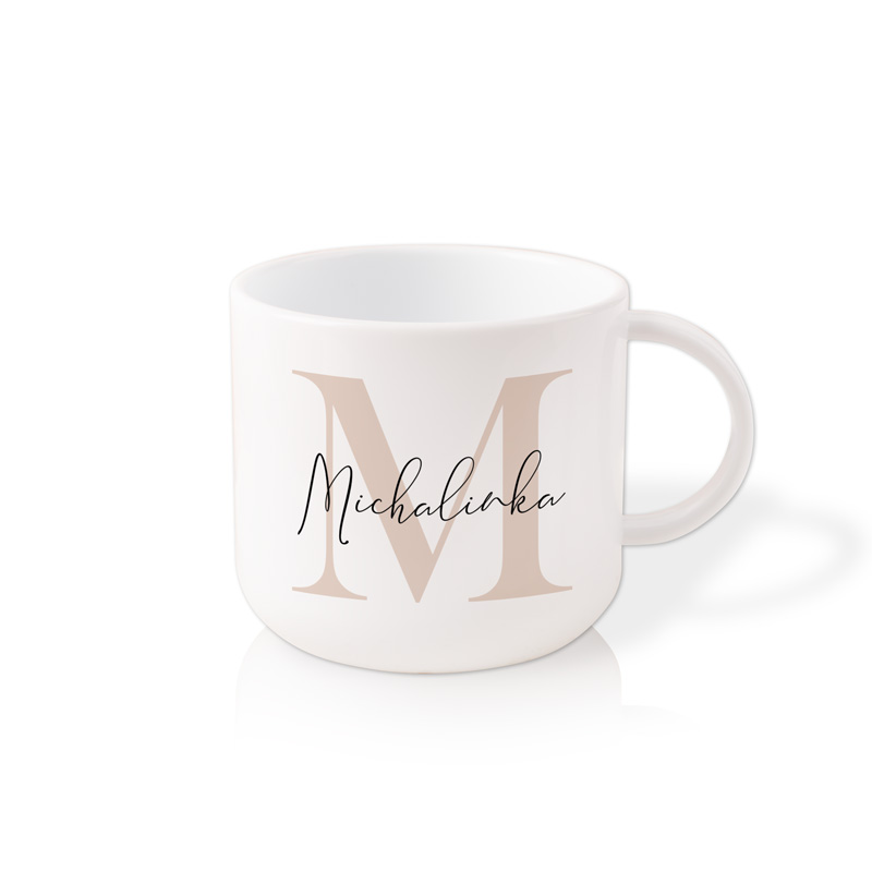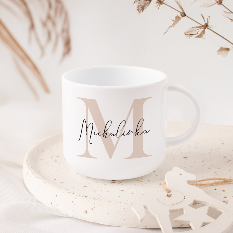 Plastikowy kubek z imieniem dla dziecka to praktyczny i estetyczny upominek, który sprawdzi się każdego dnia. Wyróżnia się personalizacją imieniem i dużym inicjałem w beżowym odcieniu.