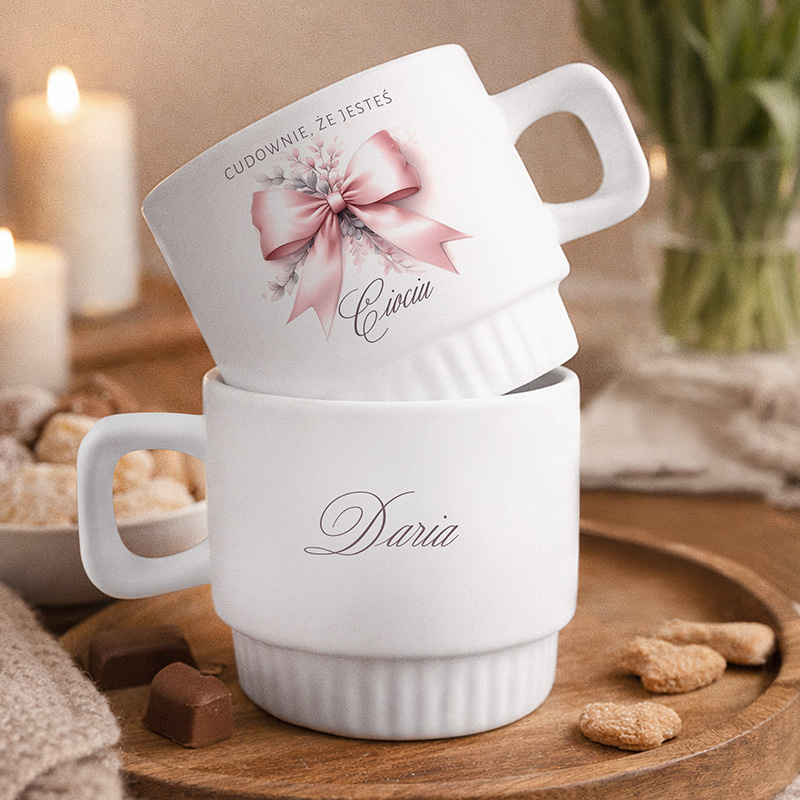 Ryflowany kubek z dedykacją dla cioci lub mamy chrzestnej to piękny prezent na wiele okazji. Personalizowany napis i subtelna grafika sprawiają, że zwykły kubek staje się pamiątką z Chrztu lub Komunii, pełną ciepła i wdzięczności.