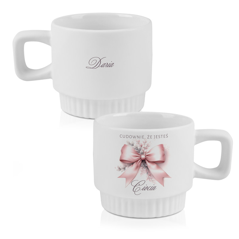 Kubek wykonany jest z ceramiki i wyróżnia się modnym ryflowaniem w dolnej części, które nadaje mu charakterystyczny wygląd. Na froncie znajduje się delikatna grafika z kokardą oraz napis w formie podziękowania, a dodatkowo z drugiej strony umieścimy imię, co podkreśla osobisty charakter prezentu.
