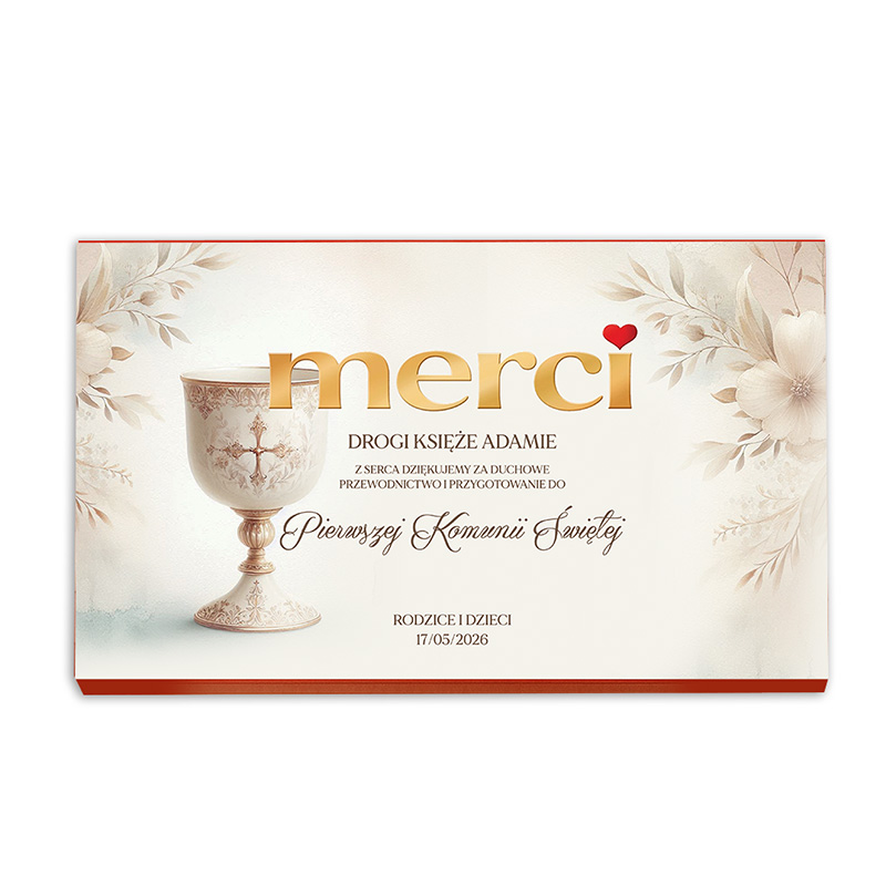 Zestaw zawiera klasyczną bombonierkę Merci z czekoladkami w różnych smakach, zapakowaną w elegancką oprawę z dedykacją dla księdza. Na froncie karty znajduje się dekoracyjna grafika z motywem kielicha komunijnego oraz subtelne elementy roślinne. Centralnym elementem projektu jest napis „Merci” oraz podziękowanie skierowane do księdza za duchowe przewodnictwo i przygotowanie dzieci do przyjęcia sakramentu Pierwszej Komunii Świętej. Personalizacji podlega imię księdza, podpis oraz data.