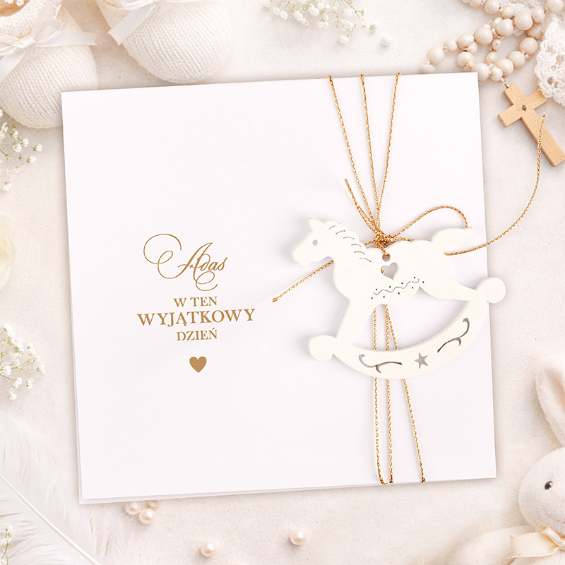 Personalizowana kartka z zawieszką to wyjątkowy dodatek do prezentu z okazji Chrztu Świętego. Minimalistyczny design oraz zawieszka w kształcie konika na biegunach sprawiają, że kartka staje się nie tylko formą życzeń, ale również piękną pamiątką na lata.