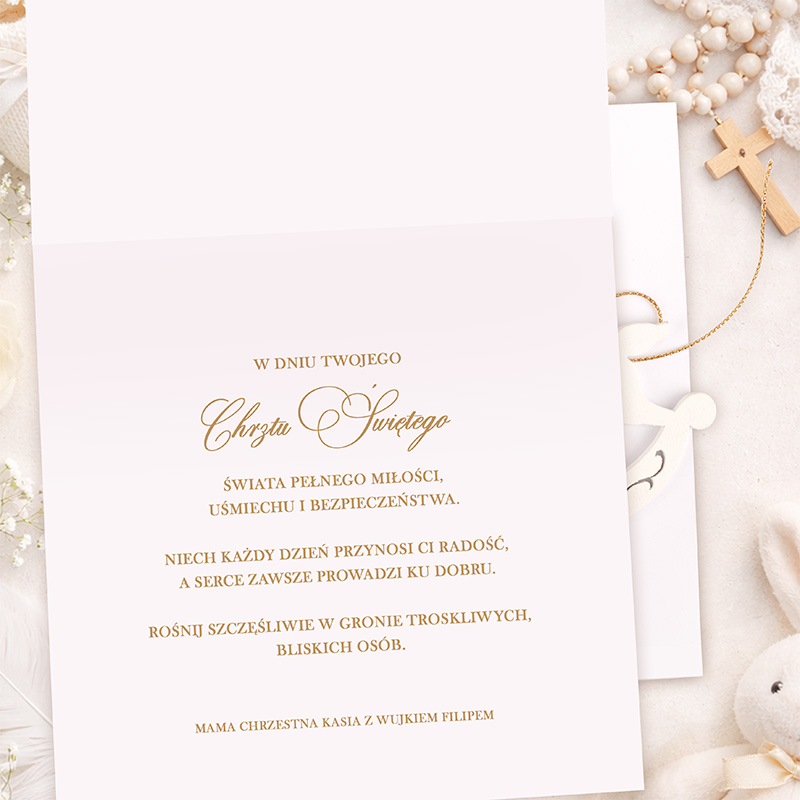 Kartka jest w jasnej kolorystyce, idealnie wpisującej się w charakter uroczystości Chrztu Świętego. Na okładce znajduje się elegancki napis „IMIĘ + w ten wyjątkowy dzień”, a całość uzupełnia ozdobna zawieszka, którą można zachować jako symboliczny upominek dla dziecka. Możliwość personalizacji sprawia, że kartka nabiera indywidualnego charakteru i staje się jeszcze bardziej wyjątkowa.
