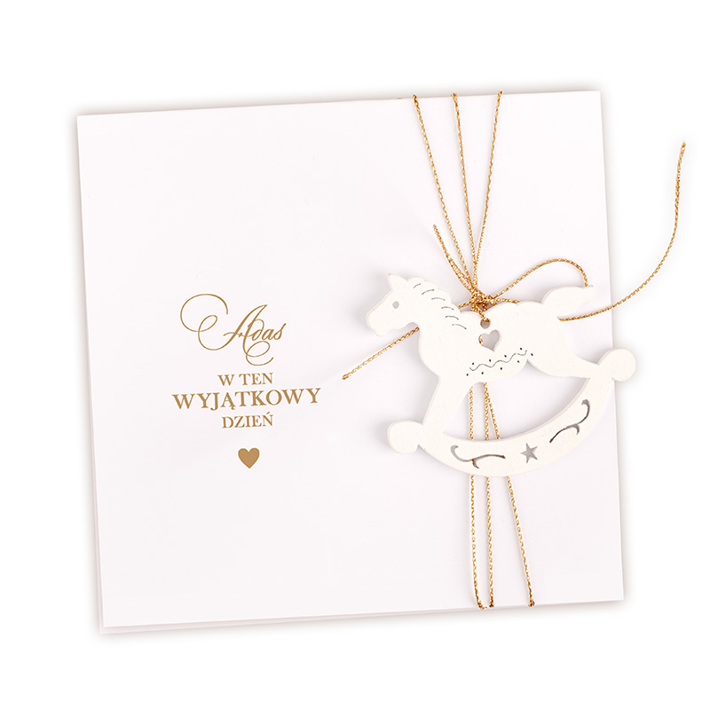 - Kartka w zestawie z zawieszką w kształcie konika na biegunach.