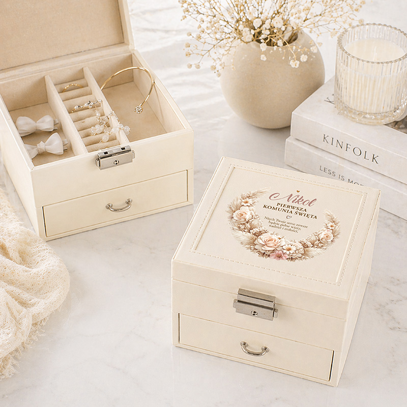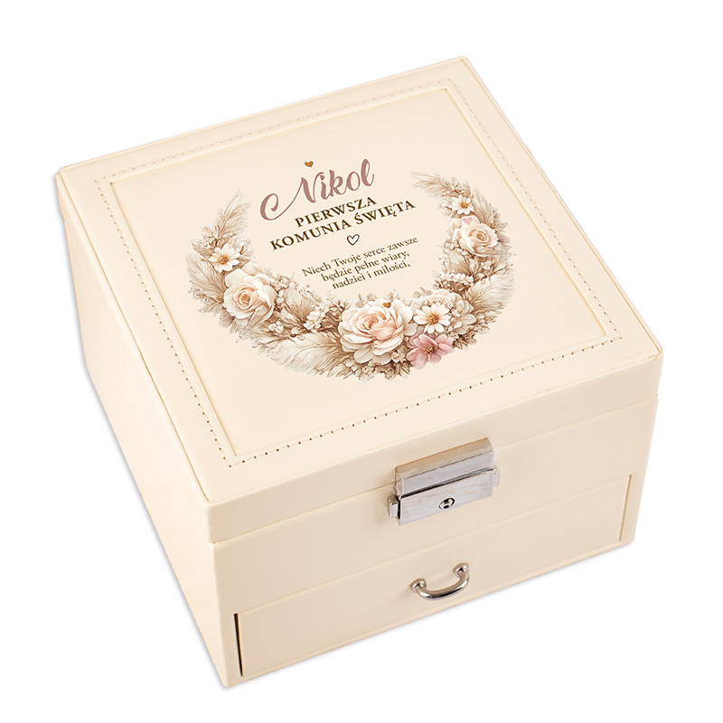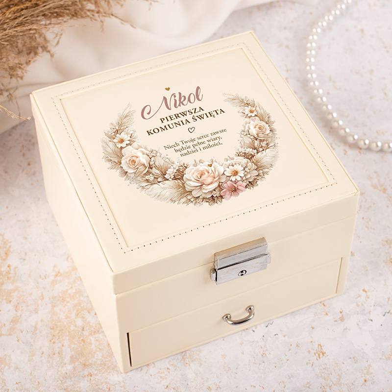 Podaruj prezent komunijny, który zachwyca od pierwszego spojrzenia i zostaje na długie lata. Personalizowana szkatułka na biżuterię to piękna pamiątka.