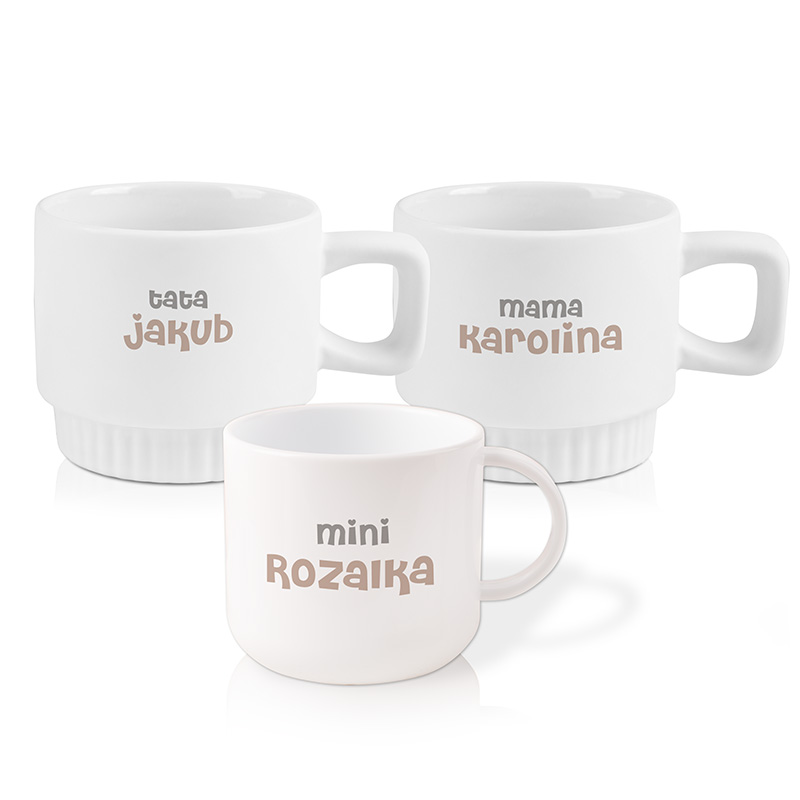 Zestaw składa się z trzech kubków. W komplecie znajdują się dwa większe kubki ceramiczne dla rodziców oraz mniejszy kubek plastikowy dla dziecka. Na powierzchni kubków znajdują się personalizowane napisy z imionami członka rodziny do którego należy kubek. Dodatkowo delikatna kolorystyka w odcieniach bieli sprawia, że zestaw prezentuje się elegancko i ponadczasowo.
