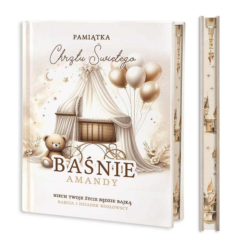 Okładka zachwyca delikatną, bajkową ilustracją w ciepłych, stonowanych kolorach. Znajduje się na niej kołyska, balony oraz uroczy miś, które tworzą spokojny, dziecięcy klimat. Na froncie umieszczamy imię dziecka oraz dedykację – to właśnie te elementy podlegają personalizacji. Książka posiada twardą oprawę, a jej brzegi są barwione na kolorowo, co nadaje jej wyjątkowego, eleganckiego charakteru. Nadruk wykonujemy nowoczesną metodą UV, dzięki czemu jest trwały i estetyczny.