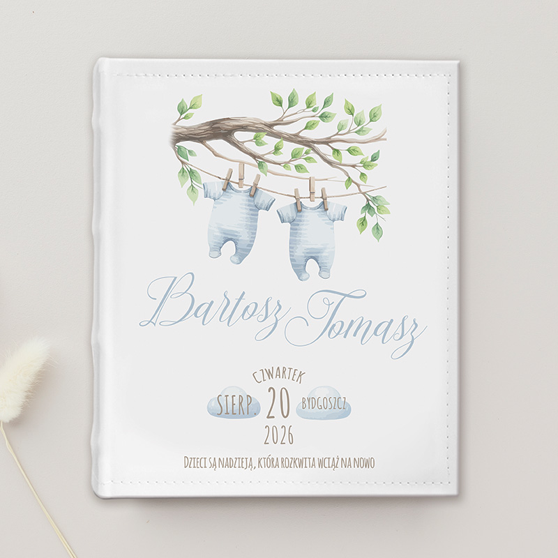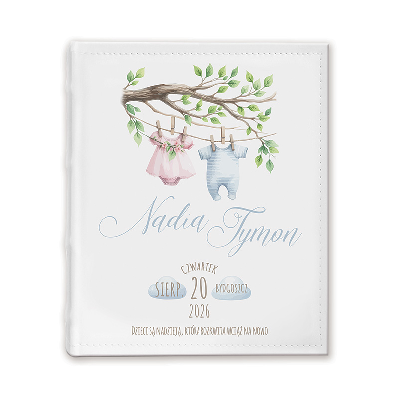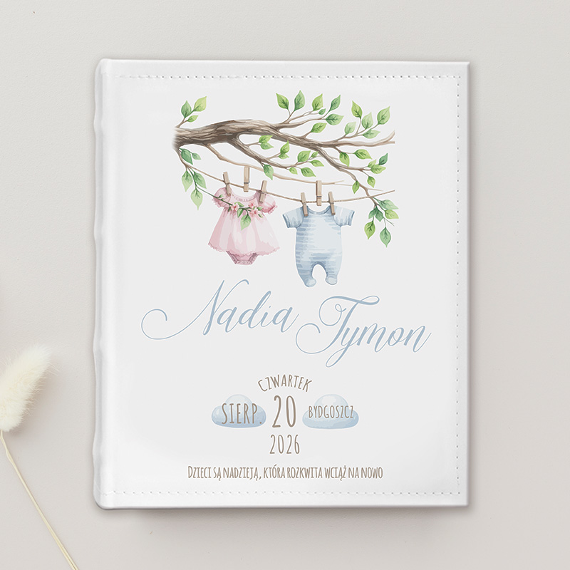 Elegancki wygląd i możliwość dostosowania czynią go nie tylko praktycznym, ale i estetycznie doskonałym upominkiem, który będzie towarzyszył rodzinie przez wiele lat. Album dla bliźniąt, dostępny z opcją personalizacji, jest zaprojektowany z myślą o dokładnym zachowaniu pierwszych wspomnień dzieci. Jego okładka, wykonana z wysokiej jakości białego materiału, dodaje elegancji każdemu wnętrzu. Na froncie znajduje się delikatna grafika z dziecięcymi ubrankami zawieszonymi na gałązce, co symbolizuje rozpoczęcie nowej drogi życiowej bliźniąt. Wkomponowane w design imiona oraz data urodzenia nadają albumowi osobisty charakter. Poniżej umieszczono sentymentalny cytat: