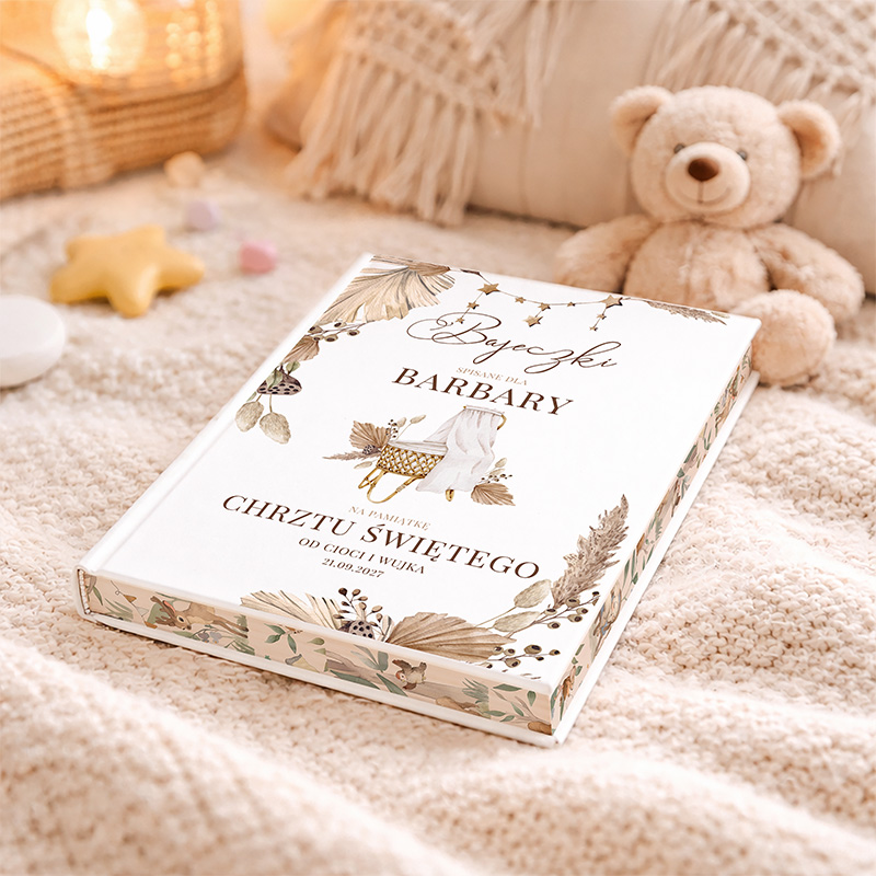 Styl rustykalny dodaje książce ponadczasowego charakteru. Kołyska z baldachimem symbolizuje delikatność dzieciństwa i troskę, którą otoczone jest dziecko. Kwiaty i listki to z kolei metafora wzrastania i rozwoju. Całość tworzy harmonijną oprawę dla osobistego upominku. Bajeczki z personalizacją dla dziecka mogą być przechowywane na półce jako ważna pamiątka. To prezent, który przypomina o obecności bliskich w dniu chrztu. Rustykalna estetyka okładki nadaje jej klasy i elegancji. Delikatność ilustracji wprowadza łagodny nastrój. Personalizacja na okładce wyróżnia książkę wśród innych podarunków. Taki prezent to nie tylko bajki, ale też symbol duchowej troski i bliskości. Książka może towarzyszyć dziecku przez kolejne etapy życia. To pamiątka, która z czasem nabiera wartości sentymentalnej. Bajeczki z personalizacją dla dziecka to wyjątkowy sposób na upamiętnienie jednego z najważniejszych dni w życiu dziecka.