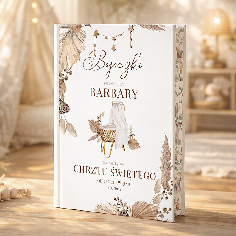 Na okładce książki znajduje się ilustracja kołyski z baldachimem, symbolizującej bezpieczeństwo, opiekę i początek nowego etapu w życiu dziecka. Całość utrzymana jest w rustykalnym stylu, który podkreśla naturalność i spokój. Kołyska znajduje się w centralnym punkcie kompozycji, co przyciąga wzrok i nadaje całości uroczysty charakter. Okładka ozdobiona jest delikatnymi listkami i kwiatkami, tworzącymi spójną, łagodną ramę. Te roślinne detale dodają subtelności i ciepła, idealnie wpisując się w nastrój chrztu. Imię dziecka znajduje się na okładce, co sprawia, że książka staje się osobistą pamiątką. Motywy dekoracyjne nawiązują do natury i rodzinnego ciepła. Taka forma prezentu sprawdza się jako gest od matki chrzestnej, ojca chrzestnego lub bliskich. Bajki zawarte w środku tworzą przestrzeń do wspólnego czytania i budowania więzi. Opowieści rozwijają dziecięcą wyobraźnię i wprowadzają w świat emocji.