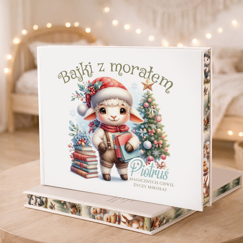 Książka bajki z morałem to pełna ciepła publikacja, która wyróżnia się zarówno treścią, jak i wyglądem. Na okładce znajduje się ilustracja słodkiej owieczki, ubranej w świąteczną czapkę i ciepły szalik. Trzyma w łapkach książki, a w tle można dostrzec pięknie przystrojoną choinkę oraz stos kolorowych tomików. Napis np. „Piotruś” umieszczony na dole okładki to przykład personalizacji – imię dziecka sprawia, że książka staje się jedyna w swoim rodzaju. Na okładce widnieje także dedykacja: „Magicznych Chwil życzy Mikołaj”. W środku książki znajdują się bajki i wierszyki z morałem, które w przystępny sposób uczą dzieci takich wartości jak dobroć, uczciwość, przyjaźń i wytrwałość. Teksty zostały stworzone z myślą o najmłodszych, dlatego są łatwe do zrozumienia i wciągające. Każda opowieść jest wzbogacona kolorowymi ilustracjami, które przyciągają wzrok i pomagają jeszcze lepiej zrozumieć treść. Całość jest wydana w solidnej, twardej oprawie, która chroni książkę przed zniszczeniem, dzięki czemu będzie mogła cieszyć dziecko przez wiele lat.