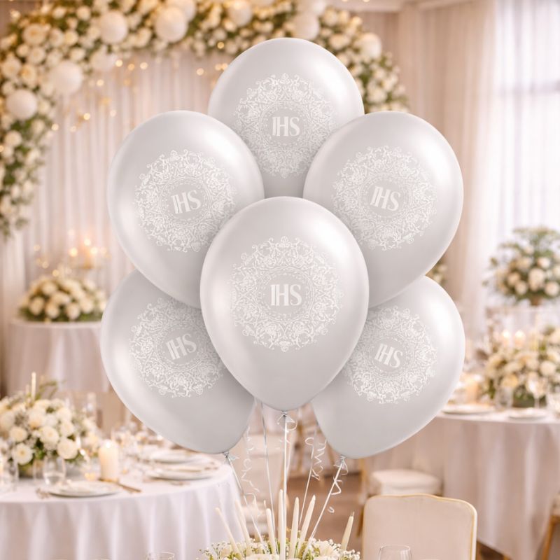 Metaliczne balony z białym nadrukiem Hostii sprawdzą się świetnie na każdym przyjęciu komunijnym!