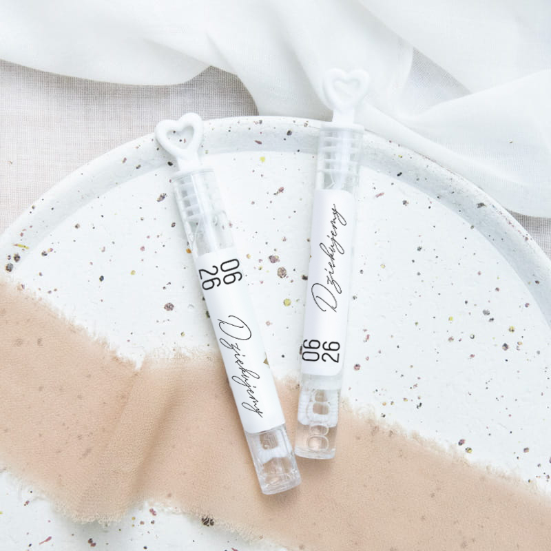 Bańki mydlane to bez dwóch zdań połączenie elegancji, klasy oraz... dobrej zabawy. Każda buteleczka jest starannie wykonana z przezroczystego plastiku, która pozwala na podziwianie refleksów światła wewnątrz bąbelków. Dodatkowo, na zamknięciu każdej bańki znajduje się malutkie serduszko. Na buteleczce znajduje się przyklejona etykieta z datą Chrztu Świętego, oraz z napisem Dziękujemy. Personalizacja czyni z upominku oryginalny prezent dla gości na Chrzest. Etykiety utrzymane są w eleganckiej, czarno-białej kolorystyce, która wzbogacona jest o złoty akcent serduszka, który doskonale komponuje się z całością wyglądu etykiety. Napis, wykonany stylizowaną czcionką dodaje produktowi klasy i sprawia, że bańki mydlane stają się nie tylko zabawką, ale i piękną pamiątką.