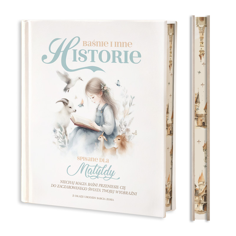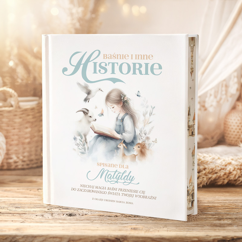 Personalizowany tomik baśni to wspaniały upominek na urodziny wnuczki. Wydanie specjalne oczarowuje przepiękną, solidną okładką z ilustracją dziewczynki zatopionej w lekturze. Ma na sobie niebieską bluzkę i ogrodniczki, a jej włosy zdobią kwiaty. Towarzyszą jej różnorodne zwierzęta: ptak, koza, sarenka i motyle. Delikatne ilustracje florystyczne oraz pastelowa paleta barw nadają okładce subtelny urok. Na górze okładki widnieje tytuł "Baśnie i inne historie", uzupełniony o spersonalizowany napis "Spisane dla [imię dziecka]", co czyni prezent jeszcze bardziej osobistym. Poniżej znajduje się dedykacja:
