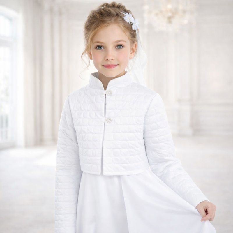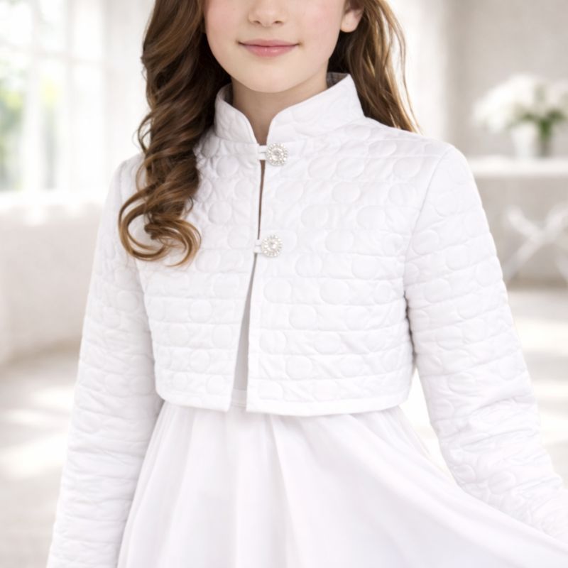 Ciekawe białe bolerko w nowoczesnej odsłonie doda szyku i elegancji każdemu dziecku komunijnemu! Kurteczka z kołnierzykiem, posiada dwa guziczki, długi rękaw oraz pikowaną strukturę. Produkt świetnie sprawdzi się podczas chłodniejszych dni i zapewni ochronę przed zimnem.