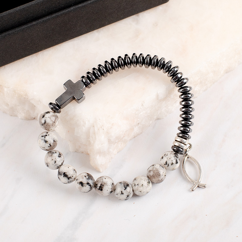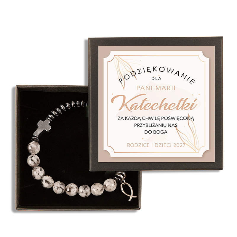 Ta elegancka bransoletka jest wyjątkowym podziękowaniem dla każdej katechetki. Eleganckie ciemne kamienie oraz krzyżyk odzwierciedlają jasność wiedzy i pasji, jaką nauczycielka religii przekazuje swoim uczniom.