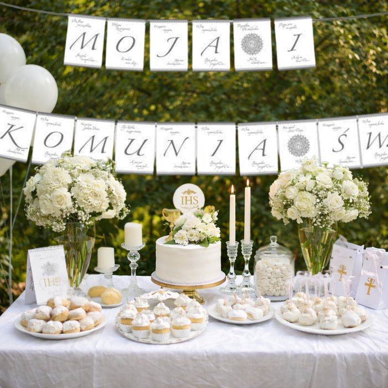 Świetny dwumetrowy baner komunijny stanowi ciekawą i bardzo efektowną dekorację każdej komunijnej sali. Produkt dwustronny - znajdziemy na nim nadrukowany napis "Moja I Komunia Św" i piękną dekorację w postaci grafiki z kolekcji Srebrna Koronka, dodatkowo na każdej literze widnieje część tekstu religijnej pieśni.