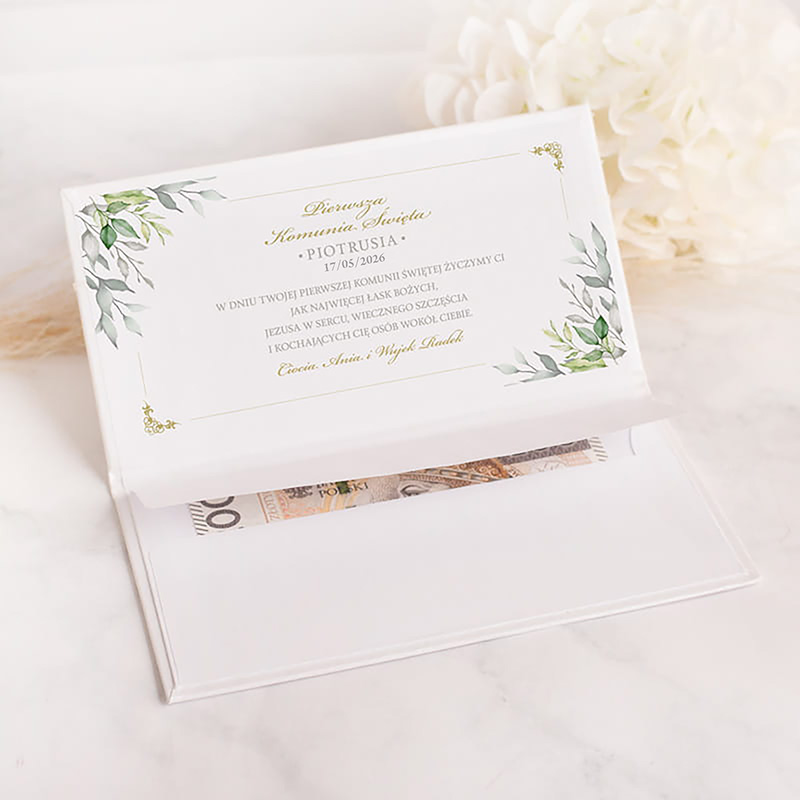 ETUI Na Pieniądze Na Pierwszą Komunię Św. Zielone Listki PERSONALIZOWANE