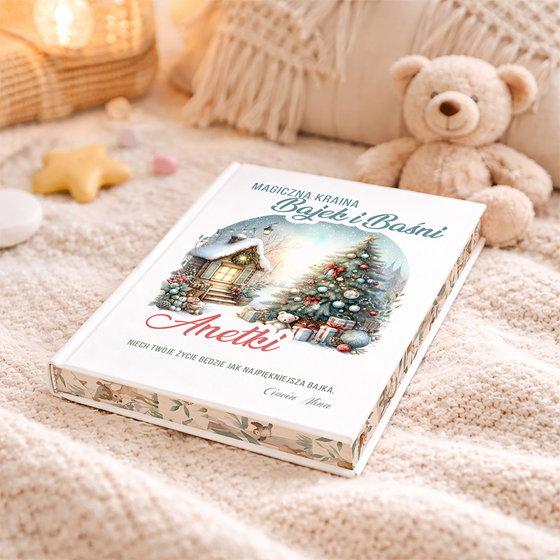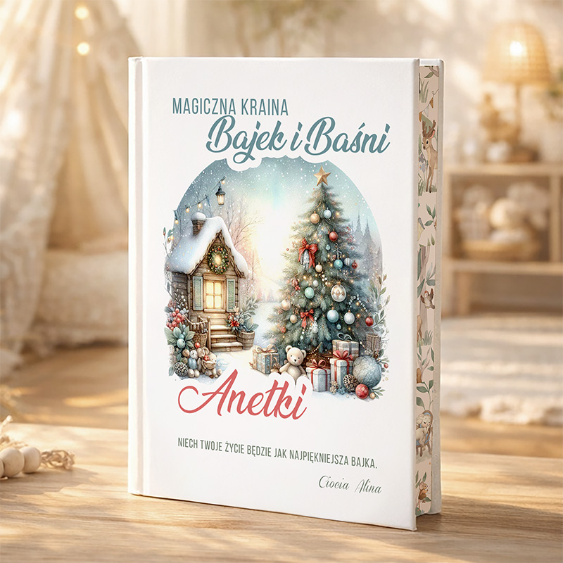 Personalizowana książka z bajkami to unikalny prezent, który zachwyci każde dziecko i przeniesie je do magicznego świata opowieści. Okładka książki prezentuje piękny, zimowy krajobraz z przytulną chatką ośnieżoną śniegiem, udekorowaną bożonarodzeniową choinką oraz otoczonym prezentami i pluszowymi zabawkami. Centralnym elementem projektu jest personalizowany napis – imię dziecka, które czyni książkę wyjątkową i pełną osobistego uroku.