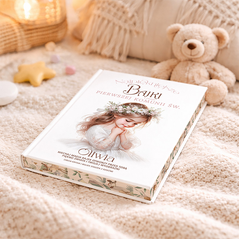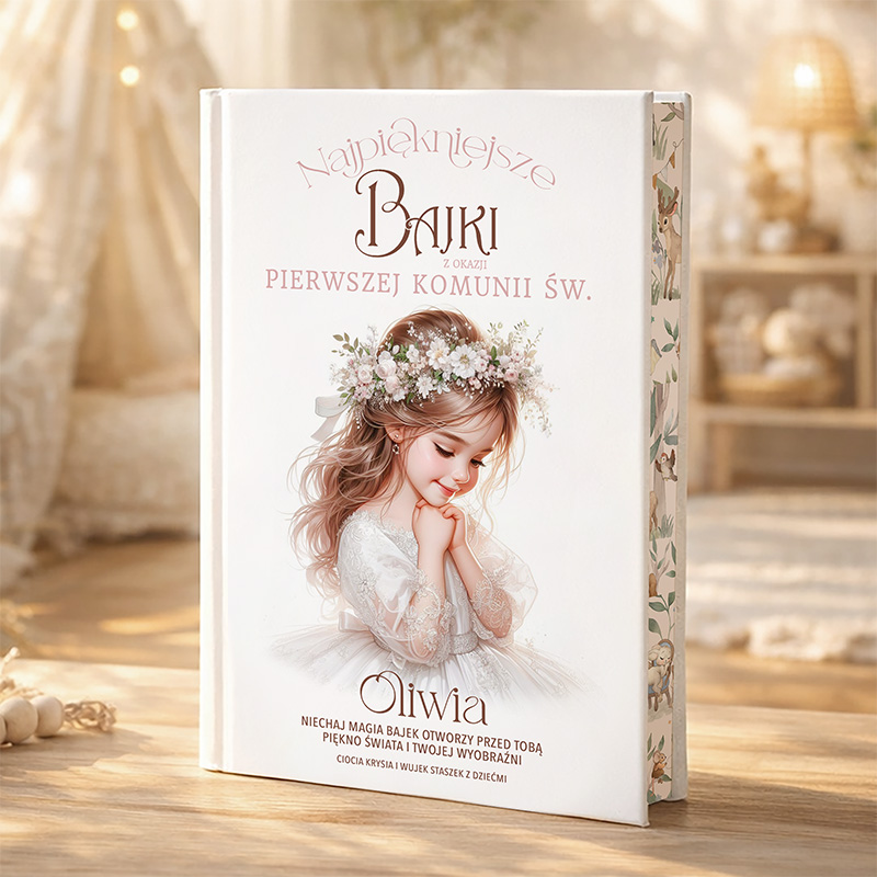 Doskonały prezent na Pierwszą Komunię – spersonalizowana książka z bajkami dla dziewczynki. Wyjątkowa pamiątka zawierająca kolekcję opowieści, które przeniosą młodą czytelniczkę do świata pełnego przygód. Wzbogacona o przepiękne, kolorowe ilustracje oraz możliwość dodania podpisu osób obdarowujących dziecko, książka jest idealnym upominkiem, który pozostanie z dziewczynką na wiele lat.