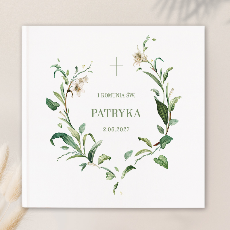 Na białej okładce znajduje się grafika pięknych delikatnych gałązek z liliami. Oprawa jest usztywniana, a w środku możemy znaleźć 50 kartek czyli 100 pustych stron, które możemy uzupełnić według własnego pomysłu. Na karcie zdobiącej księgę umieścimy imię dziecka i datę uroczystości.