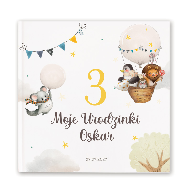 Personalizowana księga pamiątkowa to świetny pomysł na gromadzenie pamiątkowych wpisów gości. W środku ma białe kartki, które goście mogą wypełnić życzeniami dla dziecka, ale nie tylko. Na kartkach młodsi uczestnicy przyjęcia mogą pozostawić pamiątkowe rysunki. Okładka jest sztywna i solidna. Na froncie znajduje się personalizowany nadruk z kolekcji urodzinowej Wesołe Zwierzątka, na której znajdzie się również imię solenizanta, data urodzin oraz duża cyferka, która będzie symbolem wieku dziecka.