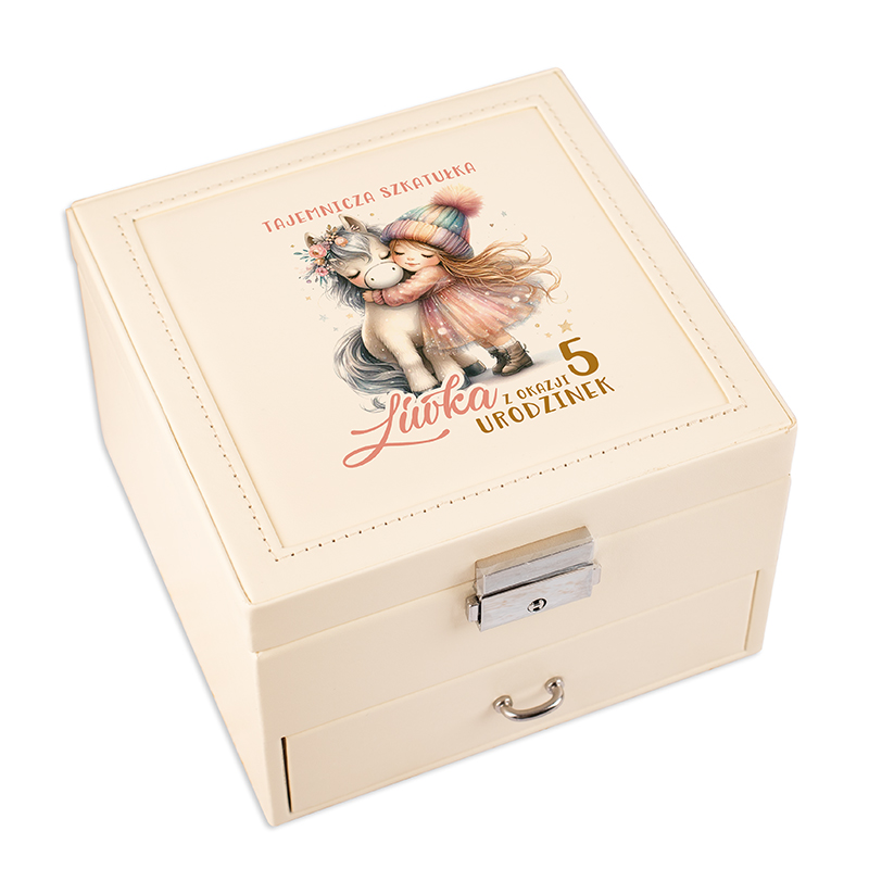 Ta wyjątkowa szkatułka na biżuterię to idealny prezent na urodziny dla dziewczynki, który łączy w sobie estetykę, funkcjonalność i osobisty akcent. Wykonana z dbałością o każdy szczegół, utrzymana w subtelnym, pastelowym odcieniu różu, zachwyca nie tylko swoim wyglądem, ale także personalizację. Wieczko zdobi ilustracja dziewczynki przytulającej jednorożca oraz nadruk z imieniem dziecka i jego wiekiem, dzięki temu szkatułka staje się niezapomnianą pamiątką urodzinową. Wnętrze szkatułki zostało wyposażono w praktyczne lustro, które ułatwia codzienne korzystanie z biżuterii i akcesoriów. Przemyślany układ przegródek pozwala uporządkować pierścionki, kolczyki, bransoletki czy spinki do włosów. Na dole znajduje się dodatkowa szufladka na dodatkowe skarby, które wymagają szczególnego miejsca. Całość zamykana jest na zamek z kluczykiem, co daje dziecku poczucie prywatności i uczy dbania o własne rzeczy. Personalizowana szkatułka na biżuterię to nie tylko piękny element dekoracyjny pokoju dziewczynki, ale także praktyczny organizer, który pomaga rozwijać nawyki porządkowania i pielęgnowania drobiazgów.