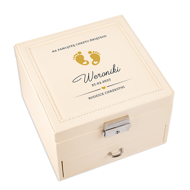 Elegancka i praktyczna szkatułka na biżuterię wykonana ekoskóry to wyjątkowy prezent na Chrzest Święty dla dziewczynki, który może jej podarować Matka Chrzestna. Jej pastelowa kolorystyka oraz subtelna grafika małych stópek nadają całości lekkości i delikatności. Szkatułka zamykana jest na kluczyk, co czyni nie tylko indywidualną, ale też praktyczną pamiątką na długie lata.