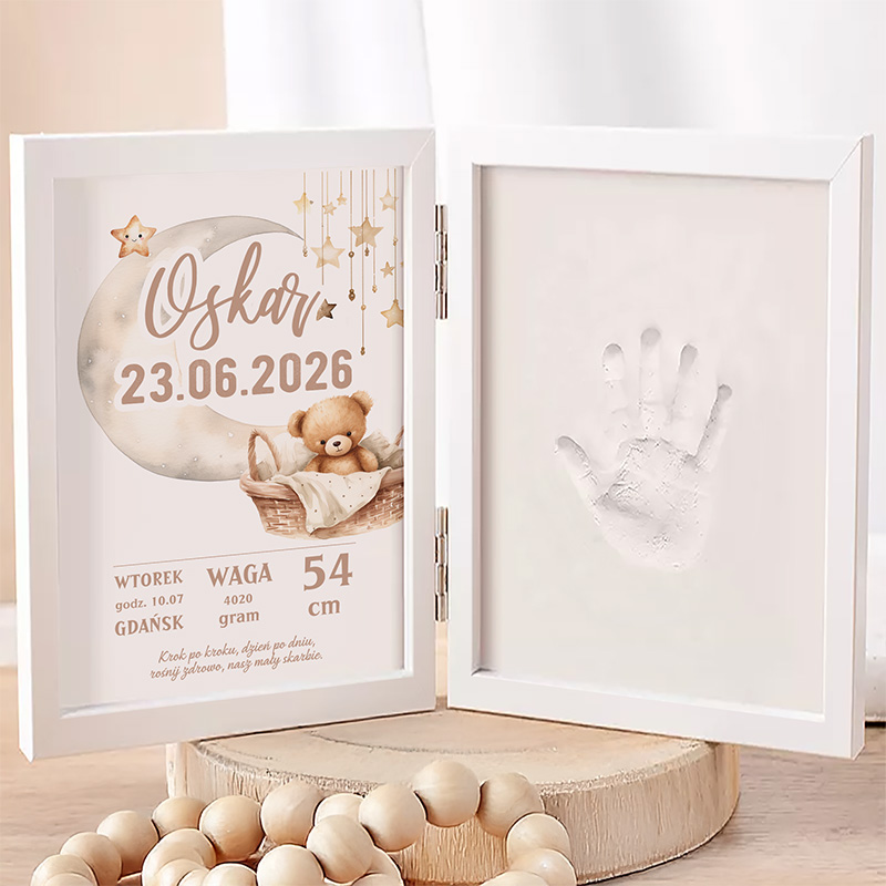 W środku znajdziesz miejsce na personalizowany nadruk z imieniem dziecka, datą urodzenia, wagą, wzrostem oraz godziną przyjścia na świat, co dodaje całości wyjątkowego charakteru. Obok znajduje się przestrzeń na odcisk malutkiej rączki, wykonany z gipsu, który zachowuje każdy detal, od linii papilarnych po delikatne wgłębienia skóry. Na tle delikatnej pastelowej grafiki przedstawiono motyw misia w wiklinowym koszyku, spoglądającego na księżyc otoczony gwiazdami, co dodaje całości ciepła i uroku. Ramka jest wykonana z wysokiej jakości drewna, w eleganckim białym kolorze, co sprawia, że doskonale komponuje się z każdym wnętrzem.